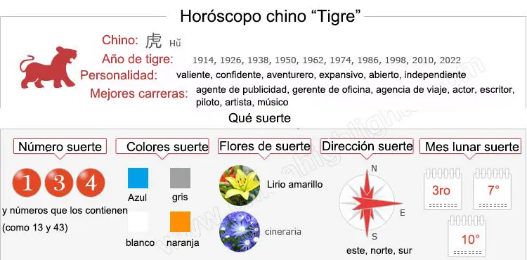 | 2034 | 19 de febrero 2034 – 7 de febrero 2035 | Tigre de Madera | Lleno de sentido de la justicia y la razón. Capacidad organizativa, creatividad. |